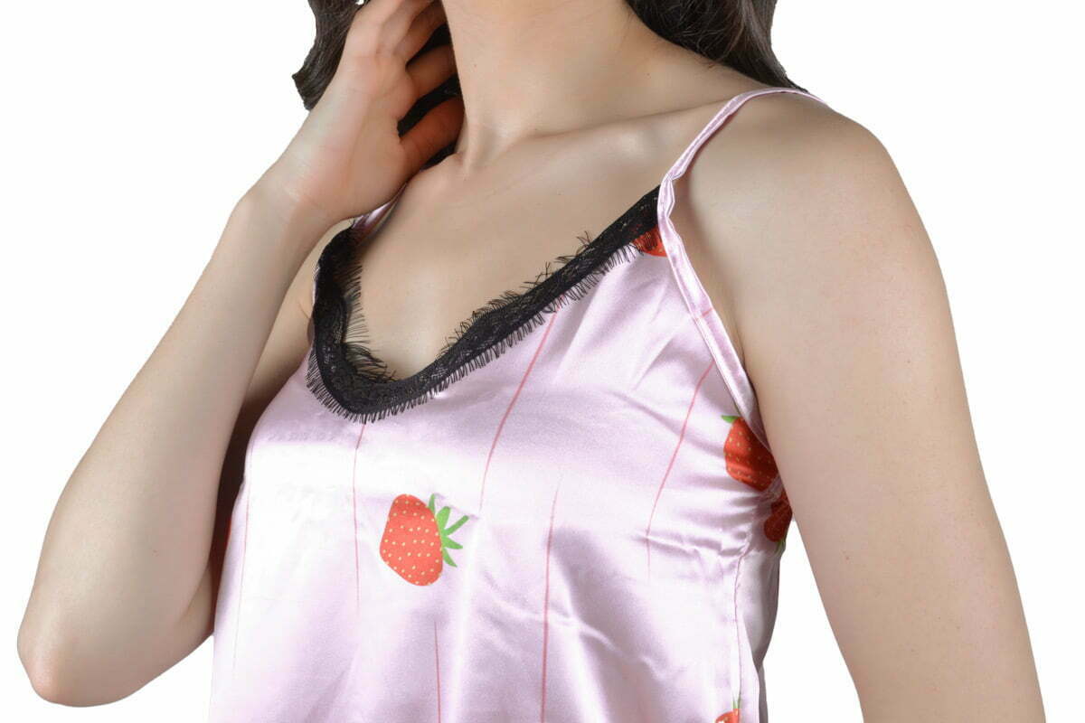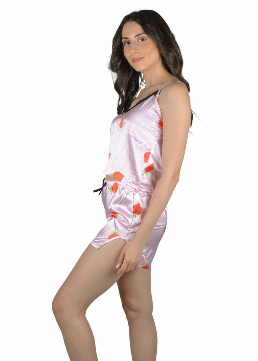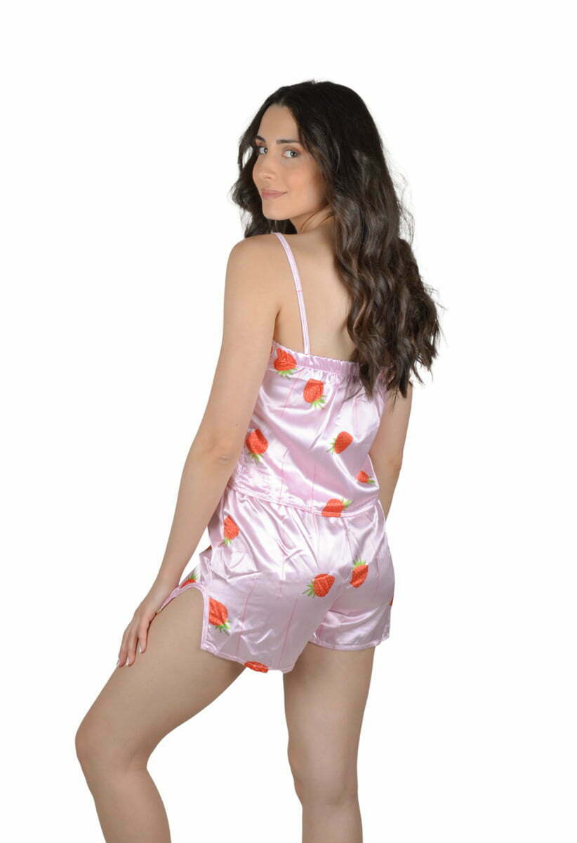 - Γυναικεία πιτζάμα σατέν με μπριτέλα και σχέδια strawberry.